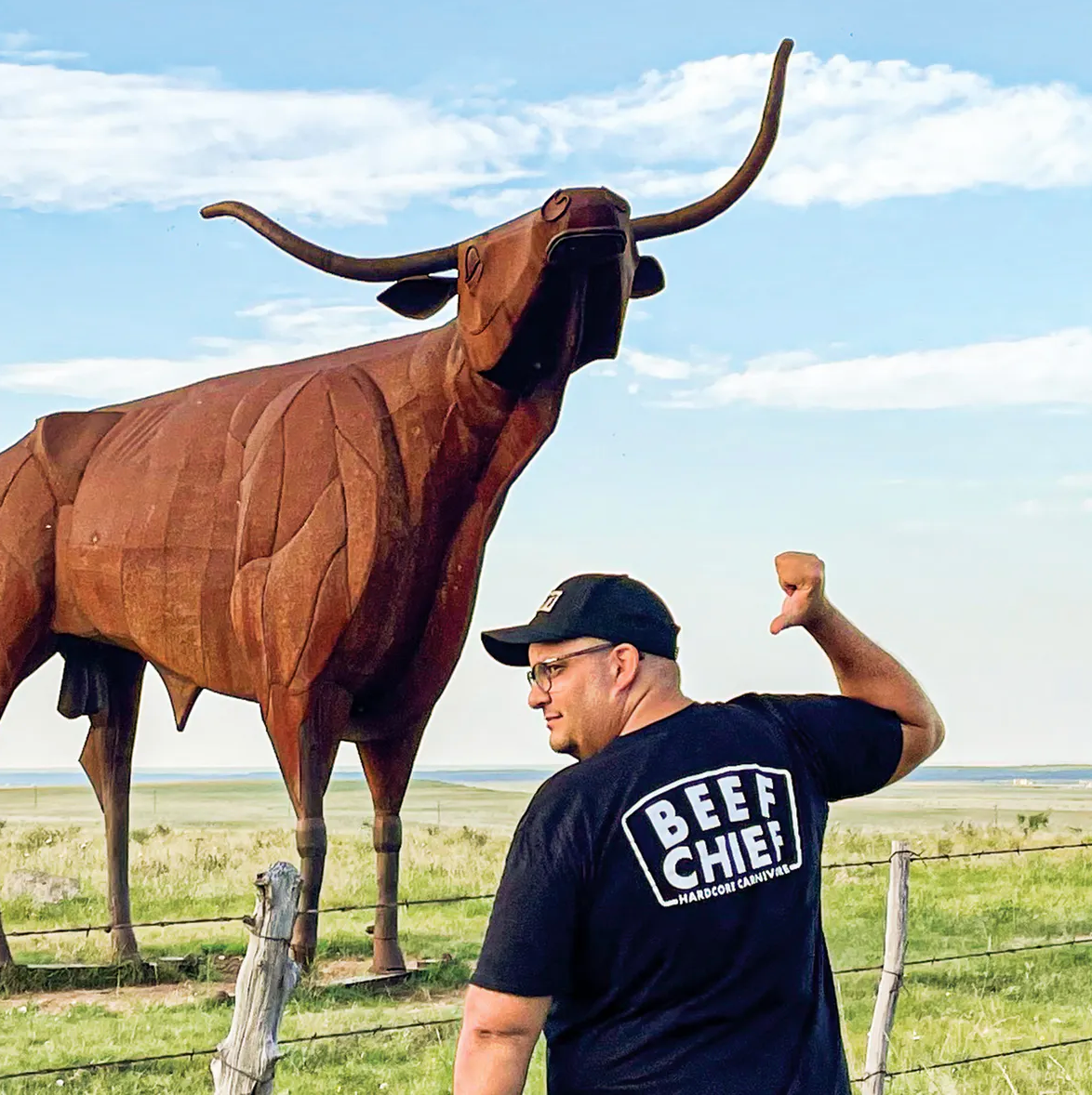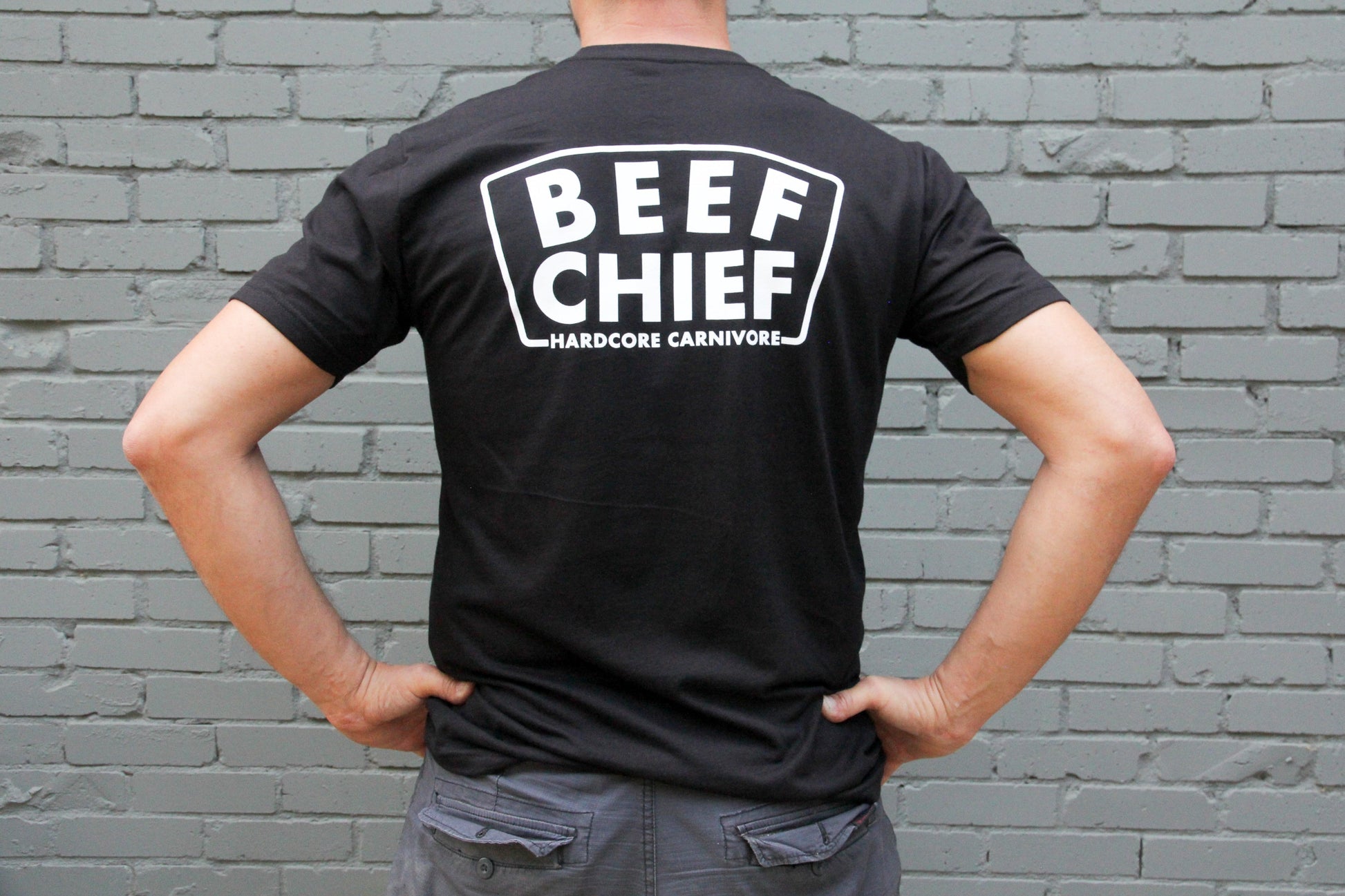 Printed in Texas on 100% cotton tees, with a small beef chief print on the front, large print on back.