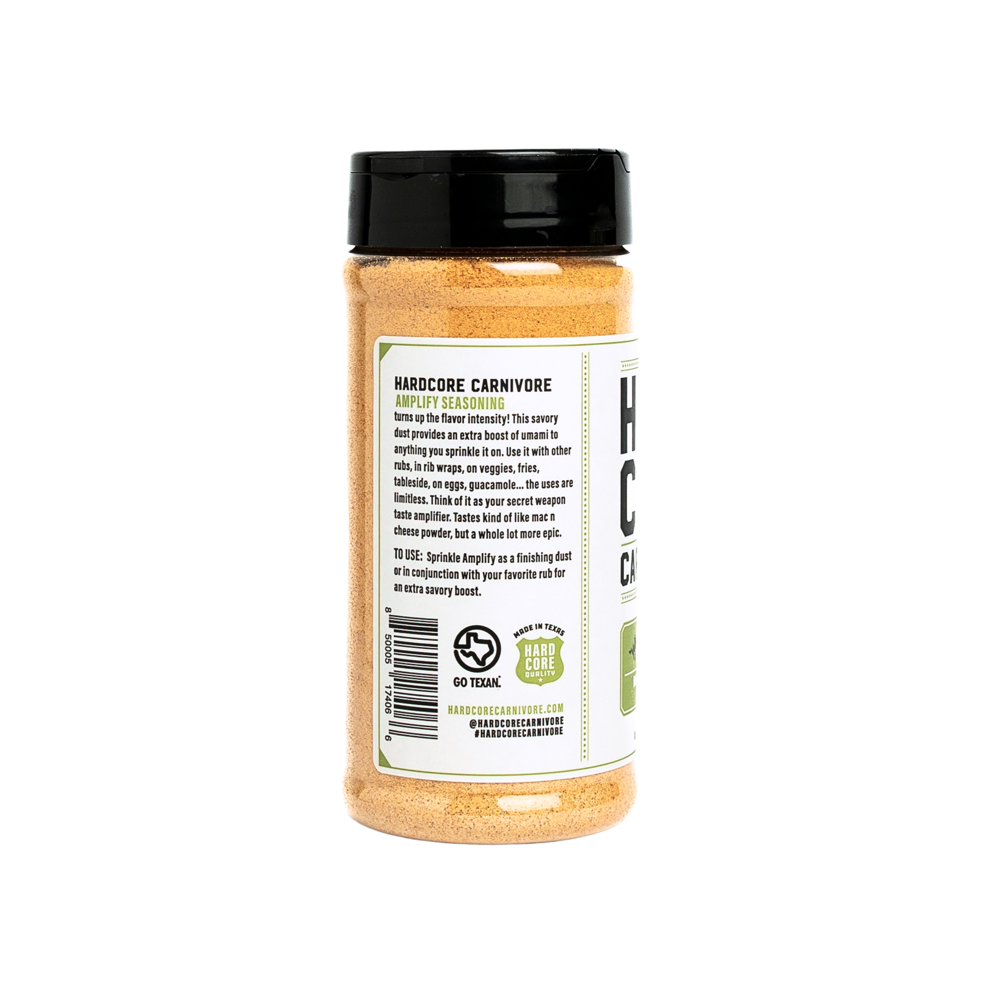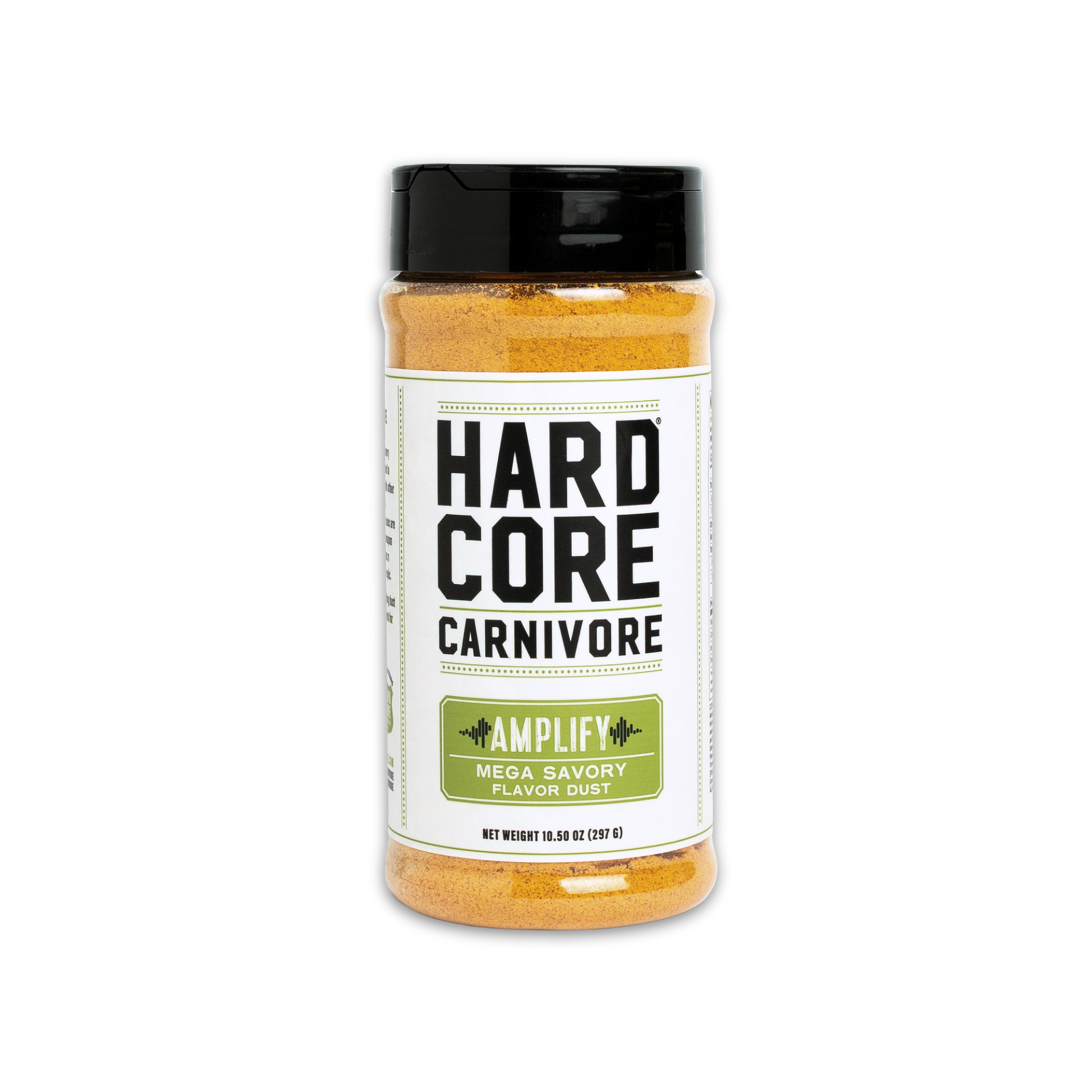 Hardcore Carnivore Amplify turns up the flavor intensity! This savory dust provides an extra boost of umami to anything you sprinkle it on. Use it with other rubs, in rib wraps, on veggies, fries, tableside, on eggs, guacamole... the uses are limitless. Think of it as your secret weapon taste amplifier.