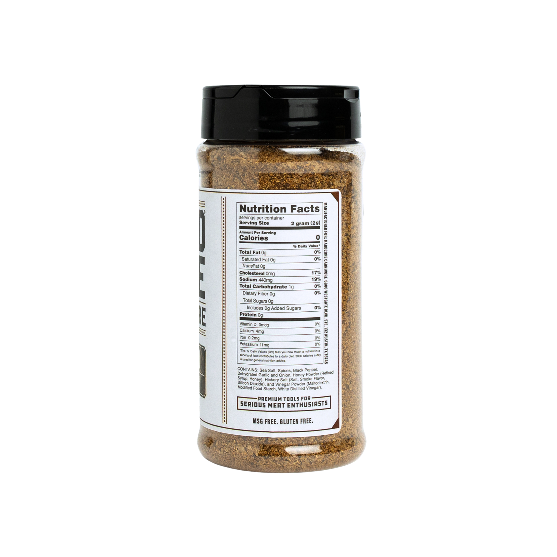 Sea Salt, Spices, Black Pepper, Dehydrated Garlic and Onion, Honey Powder (Refined Syrup, Honey), Hickory Salt (Salt, Smoke Flavor, Silicon Dioxide), and Vinegar Powder (Maltodextrin, Modified Food Starch, White Distilled Vinegar)