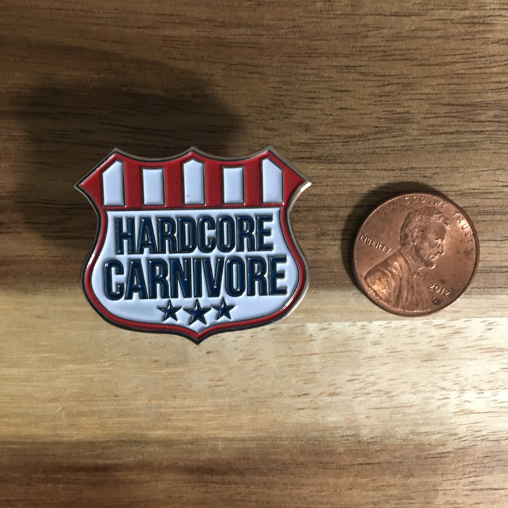 The classic Hardcore Carnivore shield logo in all it's enamel pin glory. Measures approximately 1.25" in length.